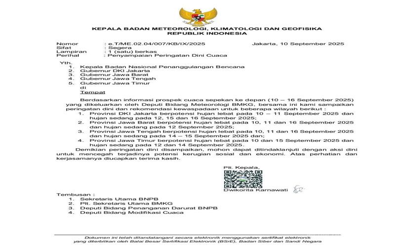 MediaSuaraMabes, Jakarta – Kepala Badan Meteorologi, Klimatologi, dan Geofisika (BMKG) Republik Indonesia, PLT. Prof. Ir. Dwikorita Karnawati, M.Sc., Ph.D., menyampaikan peringatan dini cuaca kepada Kepala Badan Nasional Penanggulangan Bencana (BNPB), serta Gubernur DKI Jakarta, Gubernur Jawa Barat, Gubernur Jawa Tengah, dan Gubernur Jawa Timur.