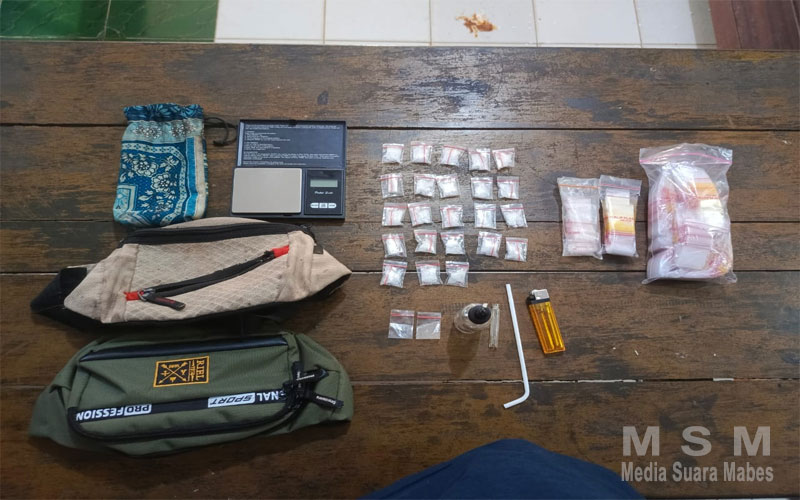 “ Kita amankan pelaku MI beserta istrinya WU di dalam sebuah pondok, dari tangan pelaku MI, kita sita barang bukti berupa 23 klip plastik bening yang berisi sabu, 2 klip plastik kosong, 1 buah alat hisap bong, 1 buah kaca fanbo, dan 1 buah pipet. Tak hanya itu, di rumah kontrakan pelaku MI yang berada di Desa Sukaraja Marau, kita juga menemukan 1 buah timbangan digital yang biasa digunakan pelaku MI untuk menimbang sabu ” Ujar Martin.