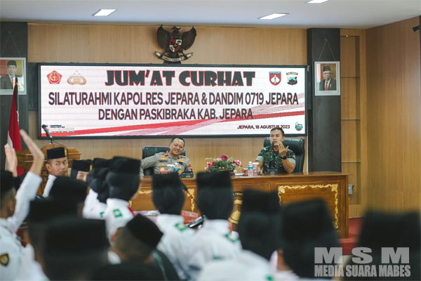 MSM TV, Jepara — Untuk menjalin silaturahmi bersama Pasukan Pengibar Bendera Pusaka (Paskibraka) Kabupaten Jepara, Polres Jepara menggelar kegiatan silaturahmi yang bertajuk “Jumat Curhat”, di Aula Endra Dharmalaksana Mapolres. Pada Jumat, (18/8/2023).