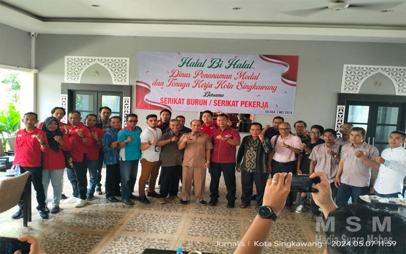 MSM TV, Singkawang Kalbar – Sehubungan dengan masih dalam suasana 1 Syawal 1445 H, Dinas Penanaman Modal dan Tenaga Kerja Kota Singkawang Bersama Polres Singkawang dan Serikat Buruh/Serikat Pekerja menggelar halal bihalal yang diadakan Restoran Taman Sari, Jl. A. Yani, Komp. Taman Sari, Gg. Telaga Biru, Kota Singkawang. Selasa (7/5/2024).