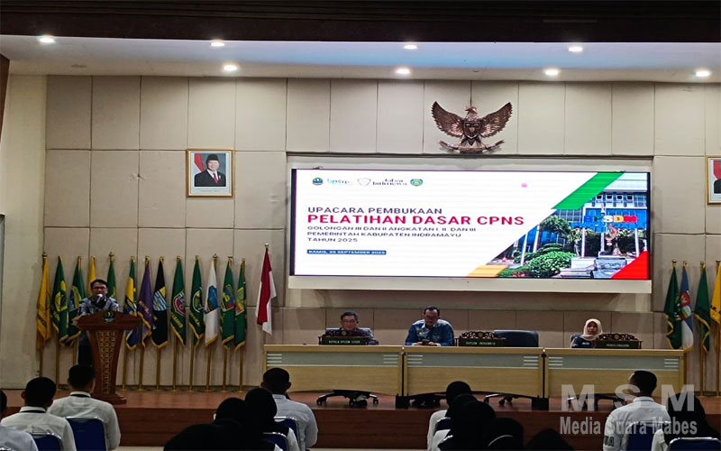 MediaSuaraMabes, Indramayu – Kepala Badan Kepegawaian dan Pengembangan sumber daya manusia Pemerintah Daerah Kabupaten Indramayu Mohammad Zaenal Muttaqin. ST. MM, didampingi Drs.Aan Endrajana.M.Si serta dihadiri kepala BPSDM Dr.Hery Antasari.ST. M.Dev.Plg, Pelaksanaan Pelatihan dasar dinyatakan di buka dan dihadiri seluruh peserta cpns sejumlah 256 orang. Kamis 25 September sampai dengan tanggal 1 Oktober 2025, Bertempat di Aula BPSDM Jl.Kolonel Masturi, KM, 3.5 Cipageran Kota Cimahi Provinsi Jawa barat.