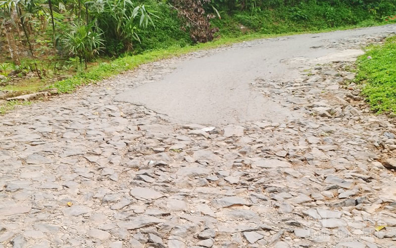 dan genangan air saat musim hujan, jalan tersebut sudah menjadi jalan bebatuan, mirip jalan kebo, permukaan jalan sangat tidak rata, Minggu 12 Oktober 2025.