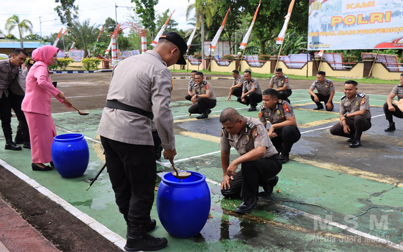 MSM TV, Melawi Kalbar – Dalam rangka kenaikan pangkat bagi personel Polres Melawi, Kapolres Melawi AKBP Muhammad Syafi’i S.I.K., S.H., M.H melaksanakan pembinaan tradisi dengan menyiramkan air kembang kepada para personel yang naik pangkat. Tradisi ini dilaksanakan di halaman Polres Melawi. (2/7) Selasa siang.