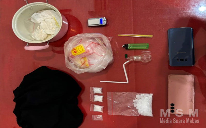 Terduga pelaku berinisial S (53) diamankan di rumahnya setelah petugas menerima informasi bahwa rumah pelaku sering dijadikan lokasi transaksi narkoba. Saat petugas mengamankan pelaku yang disaksikan perangkat warga setempat, petugas juga menyita dari tangan pelaku sejumlah barang bukti berupa 5 kantong klip plastik transparan berisi serbuk kristal diduga narkotika jenis sabu dengan berat total 27,09 gram Brutto, 1 buah timbangan digital, 1 buah alat hisap sabu atau bong, 1 pipet modifikasi sendok sabu, 1 buah korek api serta puluhan lembar klip plastik kosong.