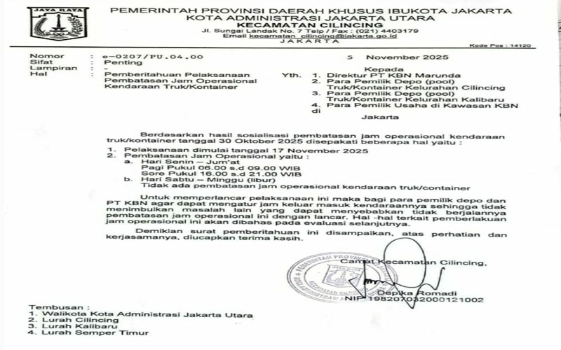 Kebijakan ini didasarkan pada Surat Pemberitahuan Camat Cilincing nomor. e-0207/PV.04.00. Berdasarkan hasil sosialisasi pembatasan jam operasional kendaraan truk/kontainer tanggal 30 Oktober 2025 , yang membatasi jam operasional truk pada dua periode, yaitu hari Senin sampai Jum’at, pagi pukul 06.00–09.00 WIB dan sore pukul 16.00–21.00 WIB, Sabtu dan Minggu libur tidak ada pembatasan jam operasional kendaraan truk / kontainer.