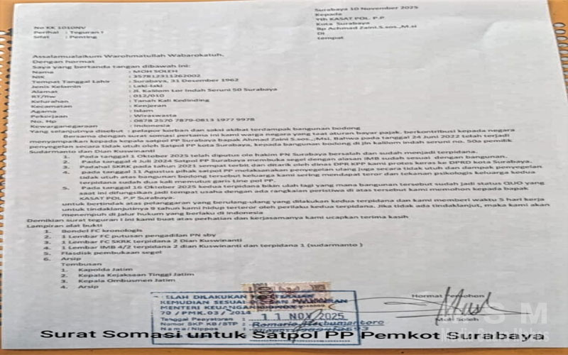 Ditemukannya sejumlah kejanggalan dalam proses persidangan yang tidak sesuai dengan kronologi kejadian awal, M Sholeh selaku pihak yang dirugikan, mempertanyakan hal ini dengan mengirimkan somasi kepada Pemkot Surabaya dan jajaran terkait sebagai pihaka yang mengetahui pembangunan gedung 3 lantai ilegal tanpa IMB yang dilakukan terpidana, Sudarmanto dan Dian Kuswinanti.
