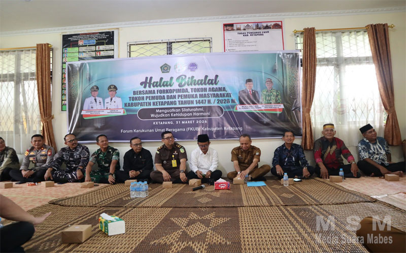 MediaSuaraMabes, Ketapang Kalbar – Kapolres Ketapang AKBP Muhammad Harris S.H., S.I.K., M.I.K., CPHR yang di wakili Wakapolres Ketapang Kompol Hoerrudin S.I.K., M.H menghadiri kegiatan Halal Bihalal yang mengusung tema “Menguatkan Silaturahmi Wujudkan Kehidupan Harmoni” bersama unsur Forkopimda, tokoh agama, tokoh masyarakat, tokoh etnis, serta organisasi wanita Kabupaten Ketapang, yang digelar di Forum Kerukunan Umat Beragama (FKUB) Kabupaten Ketapang dalam rangka perayaan Idul Fitri 1447 H / 2026 M (31/03/2026).
