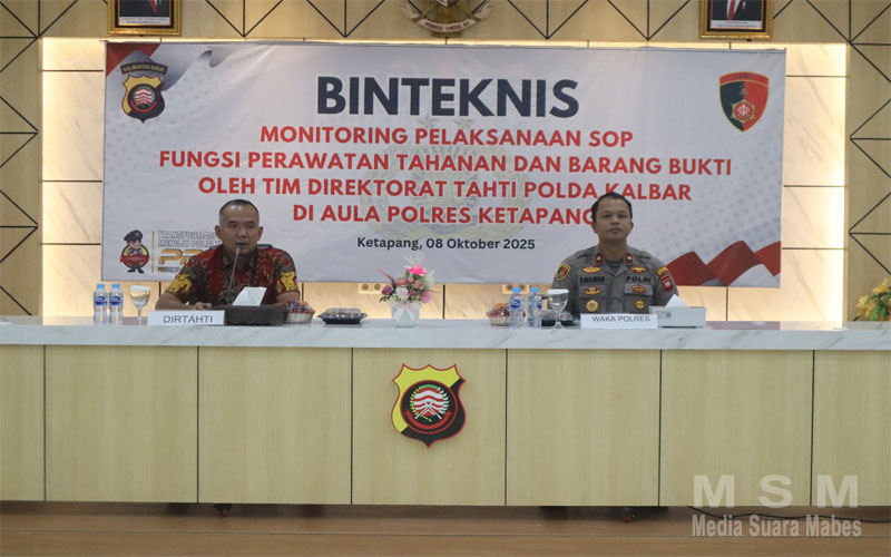 MediaSuaraMabes, Ketapang Kalbar – Direktorat Tahanan dan Barang Bukti (Dittahti) Polda Kalimantan Barat melaksanakan kunjungan ke wilayah Polres Ketapang. Kunjungan tersebut dalam rangka melaksanakan kegiatan monitoring terkait Standar Operasional Prosedur (SOP) fungsi perawatan tahanan dan pengelolaan barang bukti di Aula Mapolres Ketapang, Rabu (08/10/2025) Pukul 09.00 Wib. Kegiatan monitoring tersebut dihadiri Wakapolres Ketapang Kompol Frits Orlando Siagian, S.I.K., M.H., sejumlah pejabat utama, jajaran Kasat Opsnal, anggota Sattahti Polres Ketapang serta para Kanit Reskrim Polsek Jajaran Polres Ketapang.