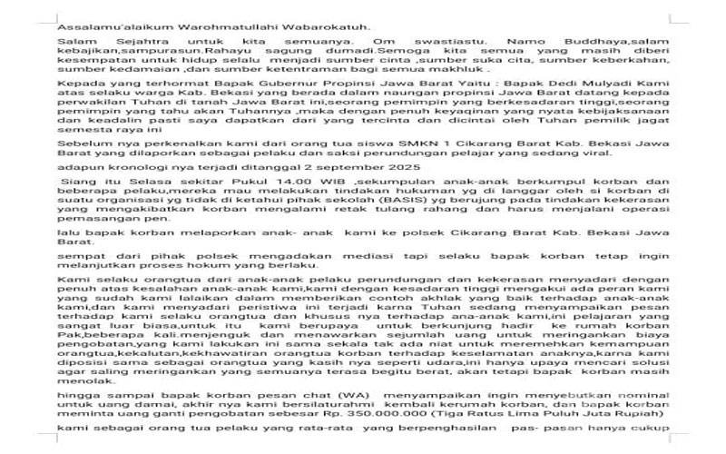 Dalam surat tersebut, para orang tua menyampaikan penyesalan mendalam serta permohonan maaf kepada keluarga korban atas kejadian perundungan yang terjadi pada 2 September 2025. Mereka mengakui adanya kelalaian dalam membimbing anak-anak mereka dan berharap adanya solusi terbaik yang tetap menghormati hak korban, namun juga mempertimbangkan masa depan pendidikan anak-anak mereka.
