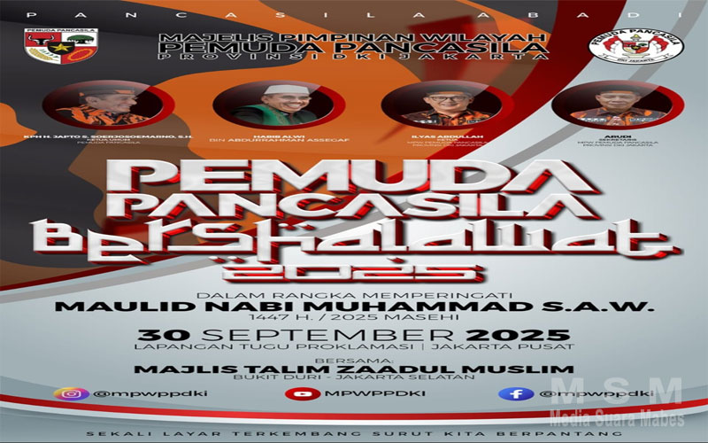 MediaSuaraMabes, Jakarta – Majelis Pimpinan Wilayah (MPW) Pemuda Pancasila Provinsi DKI Jakarta akan menggelar acara “Pemuda Pancasila bershalawat 2025” dalam rangka memperingati Maulid Nabi Muhammad SAW 1447 H / 2025 M. Acara akan dilaksanakan pada hari Selasa, 30 September 2025, pukul 19.30 WIB, bertempat di Lapangan Tugu Proklamasi, Jakarta Pusat.