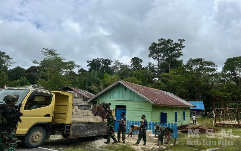 MediaSuaraMabes, Sorong Selatan – Papua Barat Daya – Dalam rangka mempererat hubungan dengan masyarakat, personel Satgas Pamtas RI-PNG Kewilayahan Yonif 763/SBA Pos Joshiro melaksanakan kegiatan memberikan bantuan berupa bahan bangunan untuk mendukung pengerjaan bangunan gereja baru di kampung Arsmin (19/11/2025).