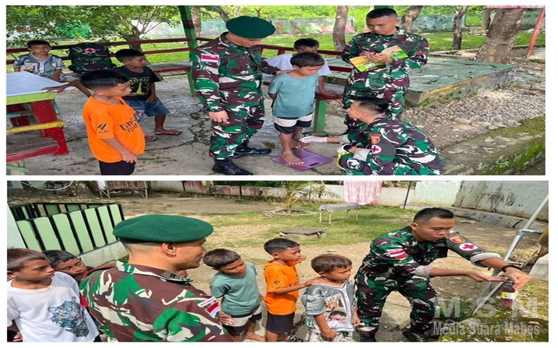 MediaSuaraMabes, NTT – Satgas Yonarmed 12 Kostrad memberikan pelayanan kesehatan bagi anak-anak perbatasan di Pos Salore, Desa Tulakadi, Kecamatan Tasifeto Timur, Kabupaten Belu, Nusa Tenggara Timur, Senin (23/02/2026).